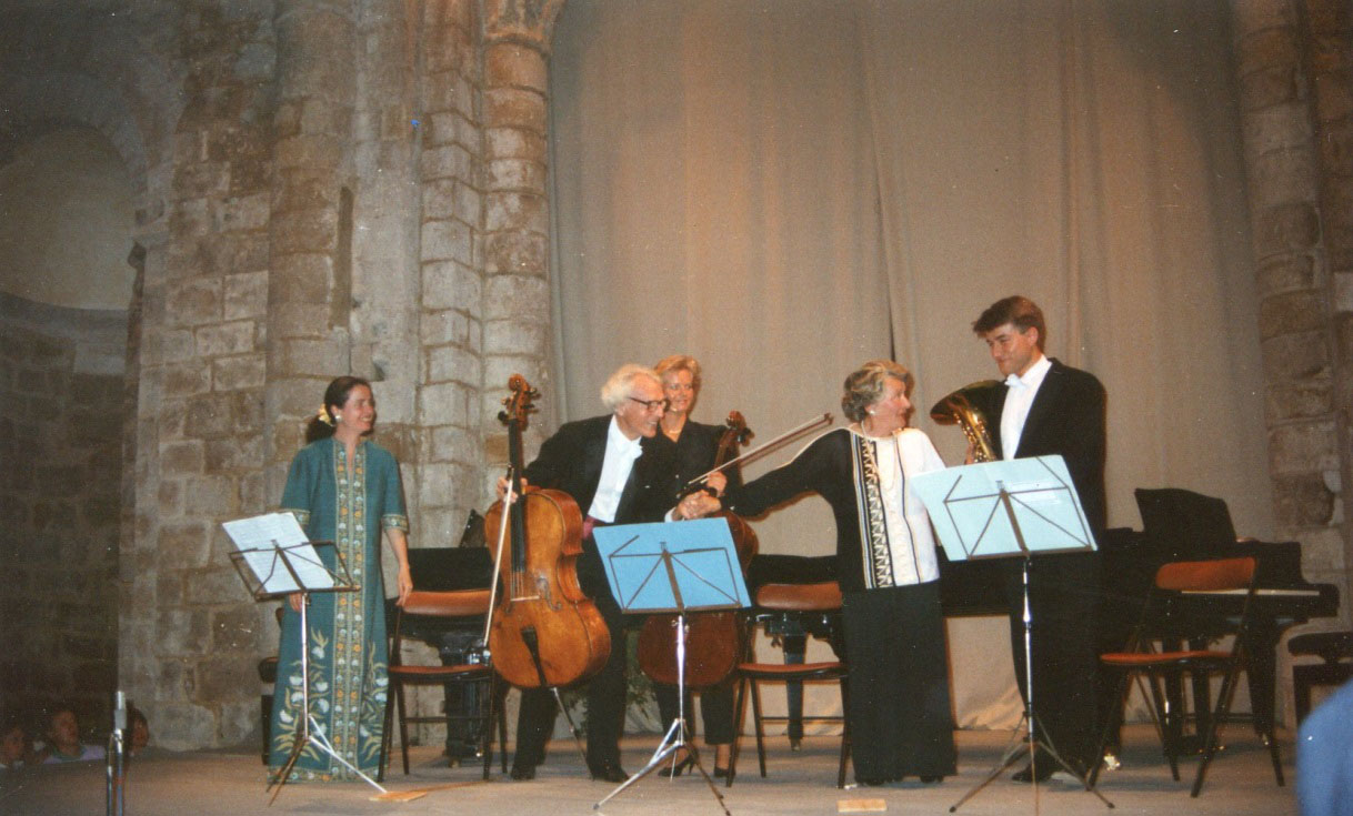 En 1989, la 16ème édition du Festival et les 75 ans de Paul Tortelier. Schumann, Maria de La Pau et Jacqueline Gotteland : pianistes – Paul Tortelier et Florence Wilson Joulain : violoncelles – Hervé Joulain : cor